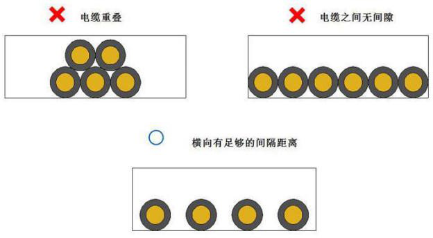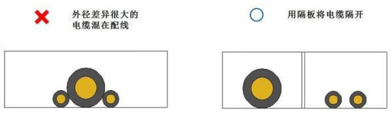 外径差异很大的电缆混在配线,需要隔板将电缆隔开,防止细线被粗线压迫并且容易断线。