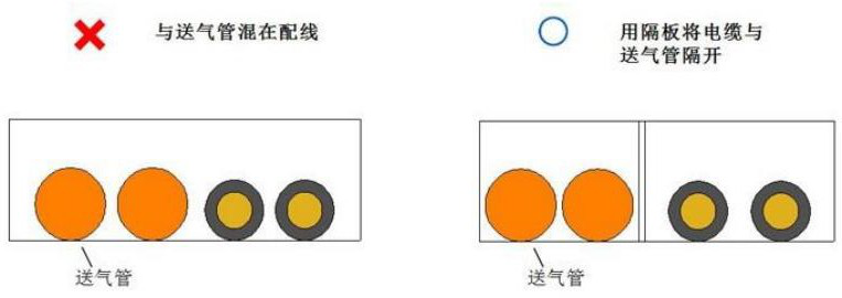 拖链电缆与送气管等较硬的物体混在配线,容易造成电缆受压断线,可以使用隔板将拖链电缆与送气管隔开。