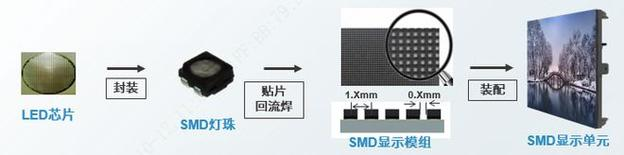 SMD技术路线是将发光芯片(晶圆)封装成灯珠,把灯珠焊接到PCB板上形成单元模组,最后拼接成一整块LED屏;