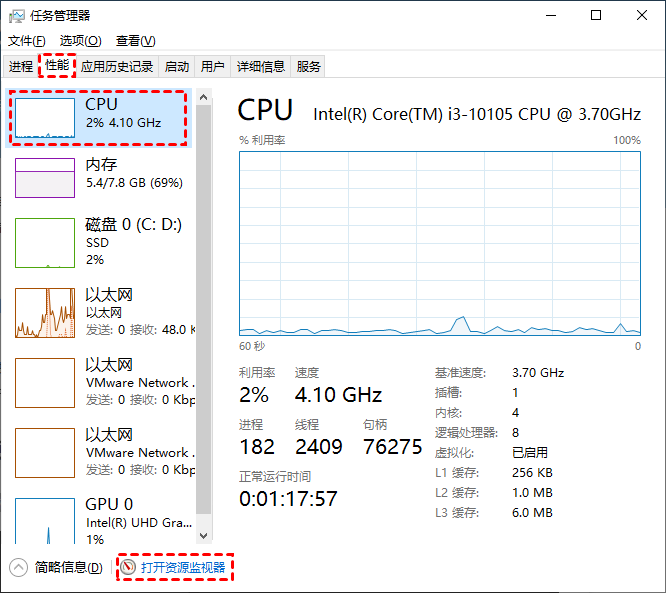 3.然后点击性能选项,再点击CPU,然后点击下方的打开资源监控器。