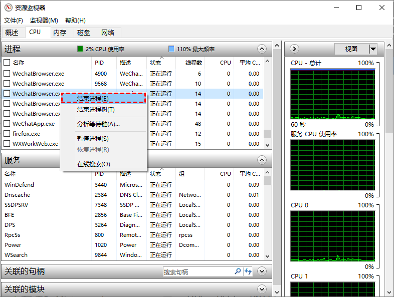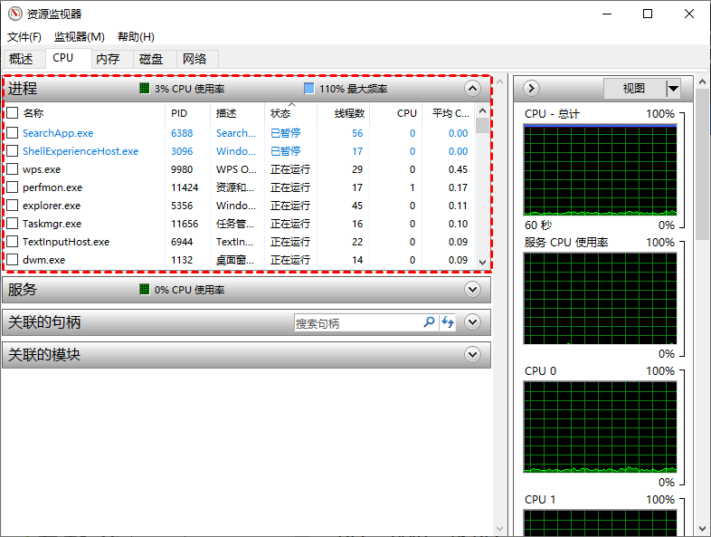 4.进入资源监视器后,点击CPU选项,就可以看到现在正在运行的程序了。