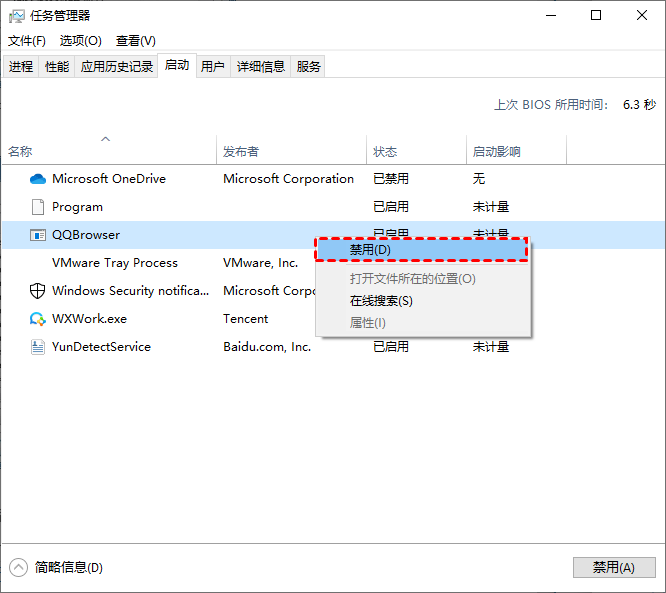 2.点击任务管理器窗口的启动选项,鼠标右键单击需要关闭启动的进程,在弹出的界面上点击禁用即可。