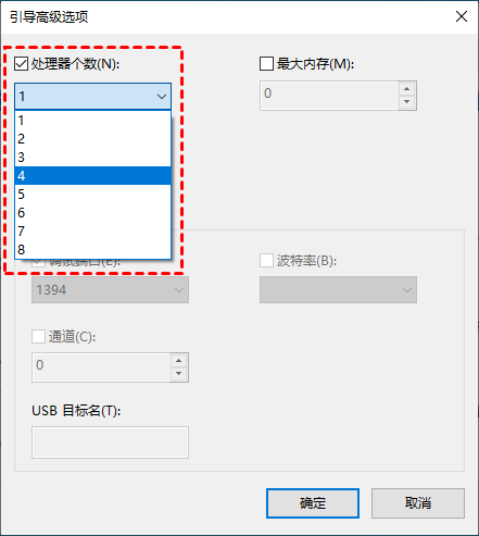 3.点击处理器个数下方的选项框,选择大的数字,再点击确定。