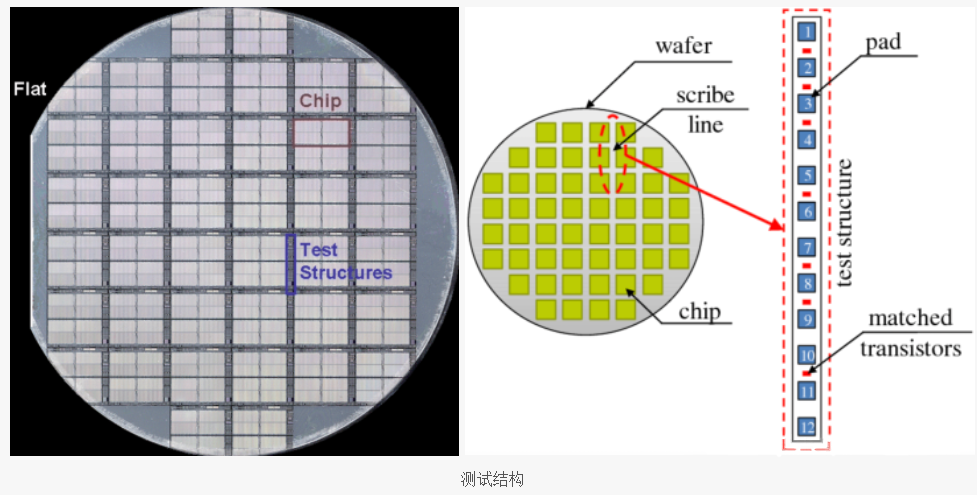 晶圆上有几个具有不寻常图案的芯片。它包含一个特殊的测试元件,由与普通die相同的工艺形成。由于IC的晶体管、二极管、电阻和电容器太小,无法在过程中进行测试,因此测试元件组用于在此过程中进行质量控制。