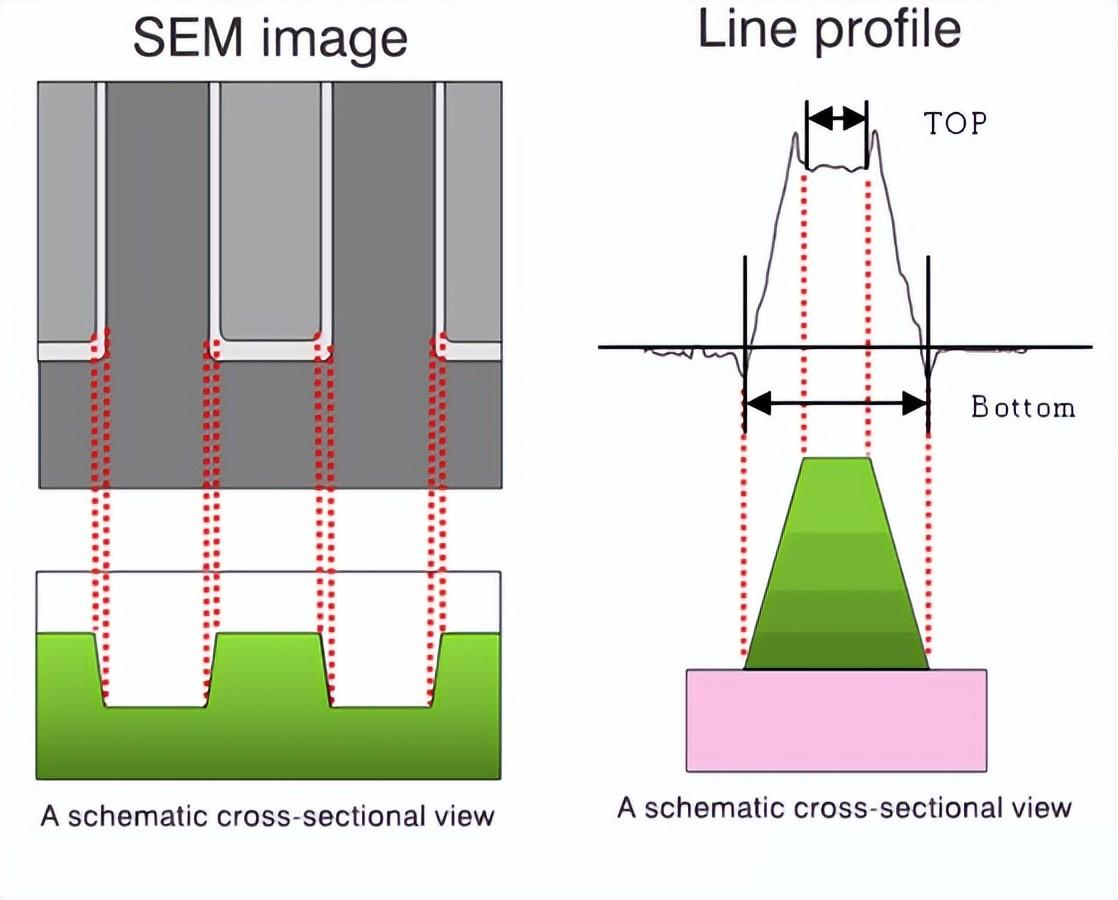光刻胶线的横截面图与SEM图像之间的关系(如下左图);如果线横截面(如下右图)所示呈梯形,则顶部和底部的宽度将不同。在这种情况下,需要在上面提到的recipe程序中指定测量的位置及高度位置。