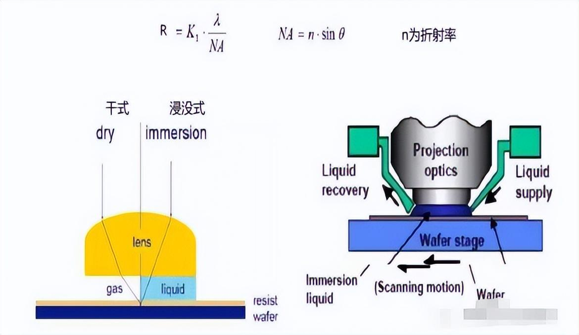 传统的光刻技术中镜头和晶圆之间的介质是空气,而浸润式光刻技术则是把空气换成了液体,比如水,这是利用了光通过液体后波长缩短从而提高分辨率的原理。