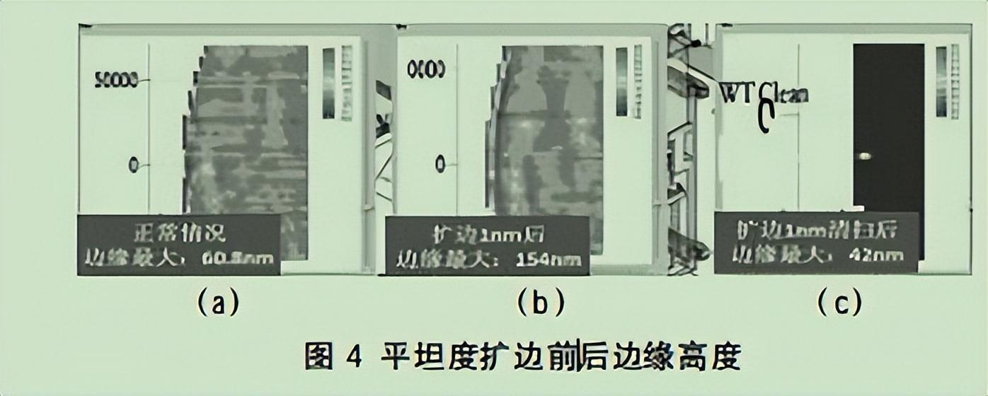在正常状态下,如图 4(a),平坦度最大值为 60.8 nm,而当我们扩边以后,如图 4(b),发现边缘出现了红色点,最大值达到 154 nm,而经过清扫后边缘结果变好,如图 4(c)。