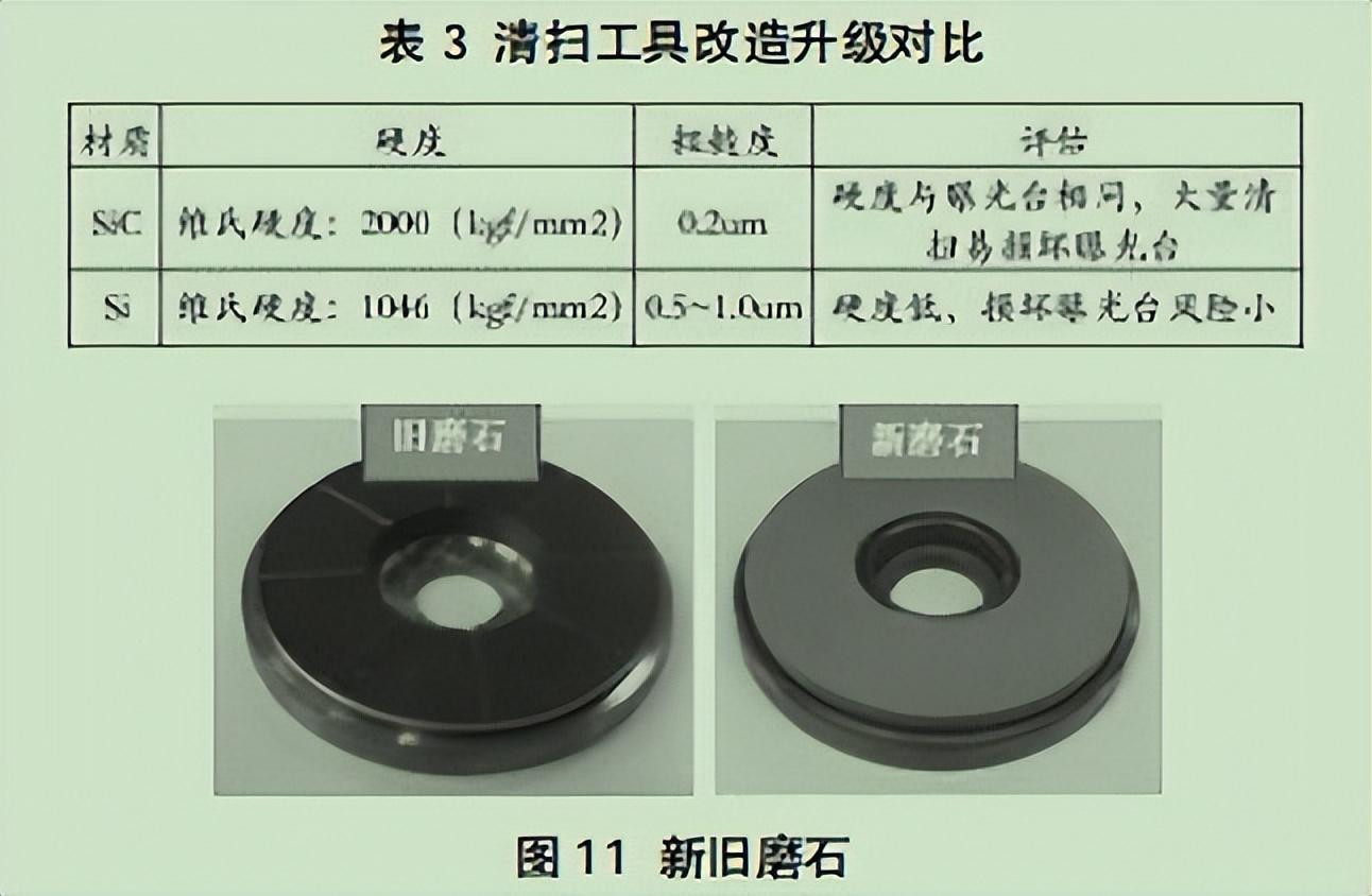 同时针对清扫工具,我们和厂商研究讨论,对传统的清扫材质进行了升级改进,降低了曝光台的损坏率,延长了关键部品的寿命,节省了成本,改造前后对比如表 3 所示,新旧磨石如图 11 所示。