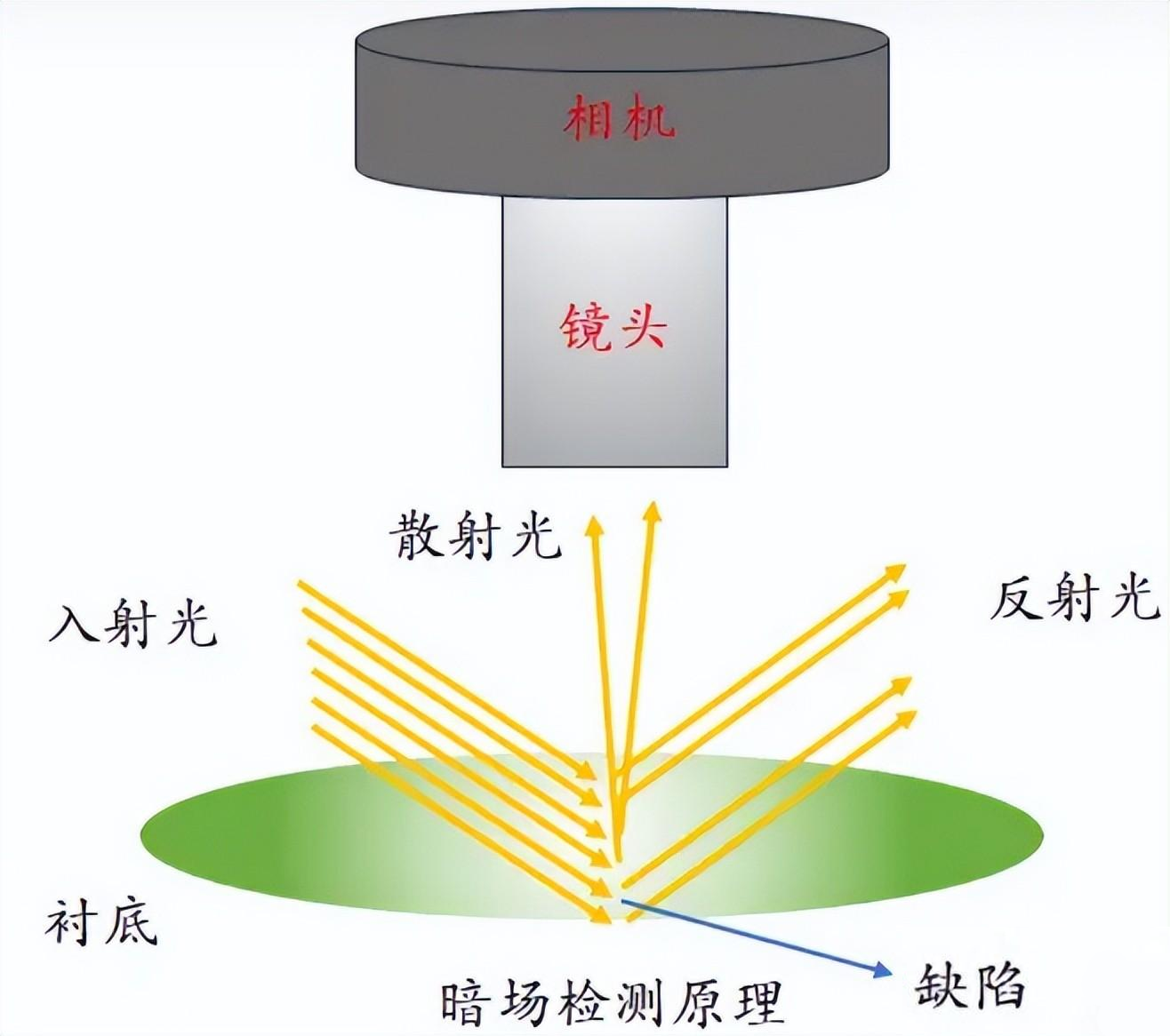 暗场缺陷检测是通过将光源放置在被检测物体的背后,使用强窄光束照射样本,通过对样本散射光线的检测,这时样本表面的视场是暗的,没有缺陷的地方一片黑暗,缺陷处有散射光亮,其对于检测晶圆表面的颗粒与表面缺陷非常灵敏。。