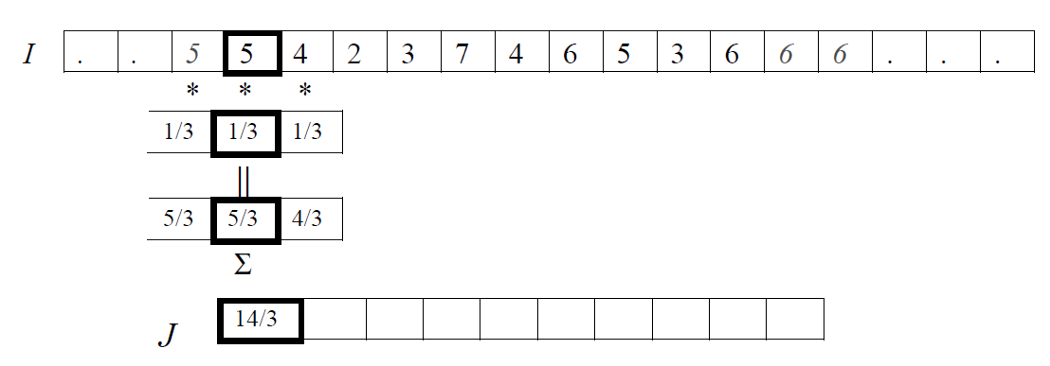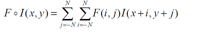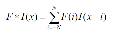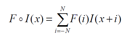 如下公式给出了使用滤波器 F 对输入数据 I 进行一维相关运算的数学公式。我们假设 F 有奇数个元素,所以当它移动时,它的中心就在图像 I 的一个元素上。所以我们说 F 有2N+1个元素,这些元素从-N索引到N,所以F的中心元素是F(0)。