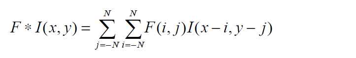 类似地,我们可以将这个概念扩展到二维,如下。基本思想是一样的,除了图像和滤波器现在是二维的,可以假设滤波器有奇数个元素,所以它用(2N+1)x(2N+1)矩阵表示。