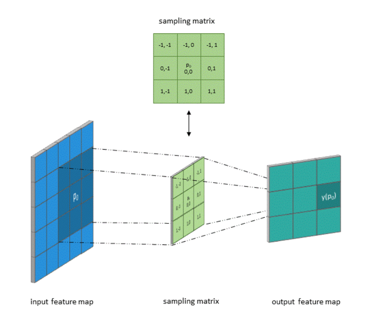 式中,Δp?表示加入正常卷积运算的偏移量。p?是枚举采样点。现在采样点位于不规则的偏移位置p?+?p?,即核的采样位置重新分布,不再是规则矩形,允许采样点扩散成非gird形状。