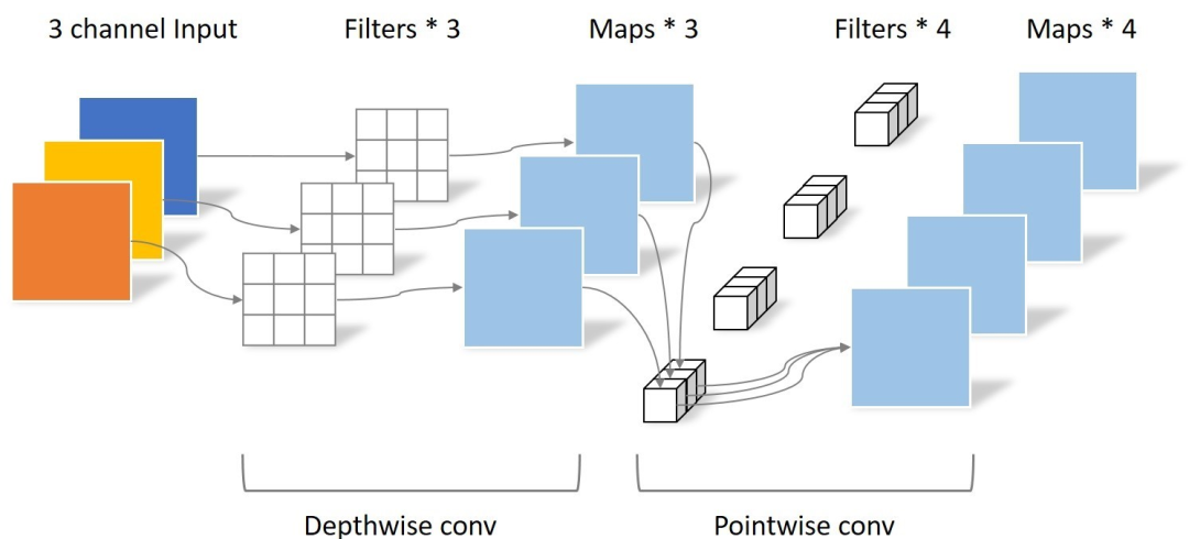 Depthwise Convolution完成后的Feature map数量与输入层的通道数相同,无法扩展Feature map。而且这种运算对输入层的每个通道独立进行卷积运算,没有有效的利用不同通道在相同空间位置上的feature信息。因此需要Pointwise Convolution来将这些Feature map进行组合生成新的Feature map。
