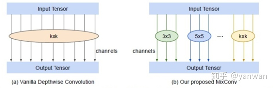MixConv将不同尺度的卷积核融合到一个单独的卷积操作,使其可以易于获取具有多个分辨率的不同模式。如下图是MixConv的结构,将通道分成了多个组,对每个通道组应用不同尺寸的卷积核。作者将其MixConv表示为普通深度卷积的一个简单替换,但可以在ImageNet分类和COCO目标检测上显著地提高MobileNets的准确性和效率。