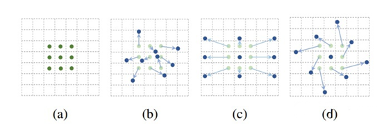 · b是变形卷积中偏移量增大(浅蓝色箭头)的变形采样位置(深蓝色点);