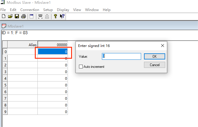 在ModbusSlave页面双击图中标记处打开数值修改页面并在框中设置一个数值后点击OK