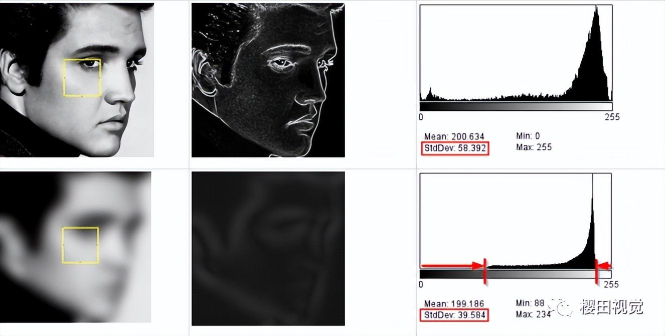 第二个原理是基于图像直方图的值的分析。可以用来计算图像的平均灰度值的像素值的变化量。方差越大,现有的灰度值边缘和图像的对比度就越高。如果图像变得不聚焦,那么之前的灰度值跳跃大的边缘就会呈现斜坡形式的梯度,导致图像的对比度降低。也就是说,图像越清晰,灰度扩散越高,图像中的对比度也就越高,图像也越清晰。
