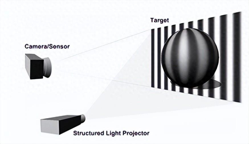 结构化光成像使用特定的(通常是调制的)光图案和2D成像相机来捕获表面的3D形貌。Photoneo是结构照明系统的一个典型示例,现已在工业上被广泛的实际应用。这个概念很简单:将已知的图案投影到表面上。当相机从一个(或多个)不同的角度查看图案时,目标的表面特征会使图案变形,如图1所示。图案变形的方向和大小用于重构目标对象的表面形貌。