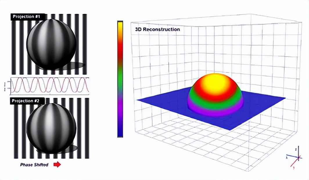 在图1所示的示例中,已说明了规则的正弦波模式。这种类型的模式通常用于相移顺序投影方法,这只是已开发的几种方法之一。其他包括连续变化的彩虹图案,灰度或色带索引,网格索引(例如,使用伪随机二进制点或2D颜色编码的点阵列)等。除了这些方法之外,还有混合方法,它们结合了多种方法来优化特定表面或目标的结果。关于各种方法的详细讨论超出了本文的范围。为了便于讨论,本文仅详细介绍相移方法。