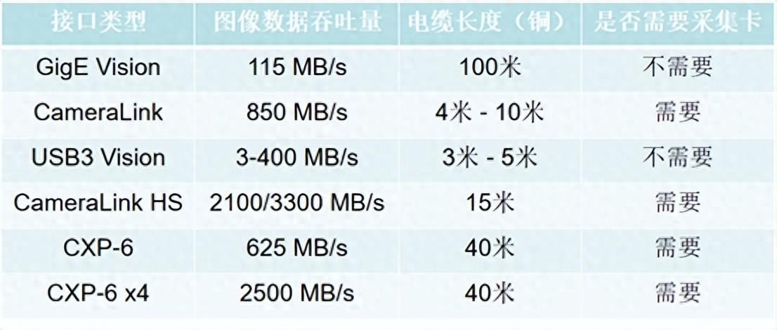 不论是在传统的基于PC的机器视觉系统中,还是在日益重要的嵌入式视觉系统中,相机数据接口的选择都是至关重要的考虑因素。越来越高分辨率的CMOS图像传感器和越来越高的检查速度,要求在相机和处理器之间传输大量数据,这对应用所需的带宽和图像数据传输距离提出了更高的要求。许多数据传输硬件已专门为机器视觉领域开发了许多种接口,包括CameralLink,GigE Vision,USB3 Vision,CoaXPress和CameraLink HS。(如图所示)。