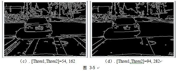 如图 3?5所示,(a)为原图的灰度图,(b)为高斯滤波平滑图,(c)和(d)分别是手动设置的高低门限值如图所示的canny边缘检测结果。根据多组图像数据测试发现,当canny高低门限值分别设置为50,150时能够保证大部分有效信息的保留且不会有过多冗余信息。因此后文中采用门限值[Thres1,Thres2]= 50,120 作为canny边缘检测参数。Opencv中以下代码实现: