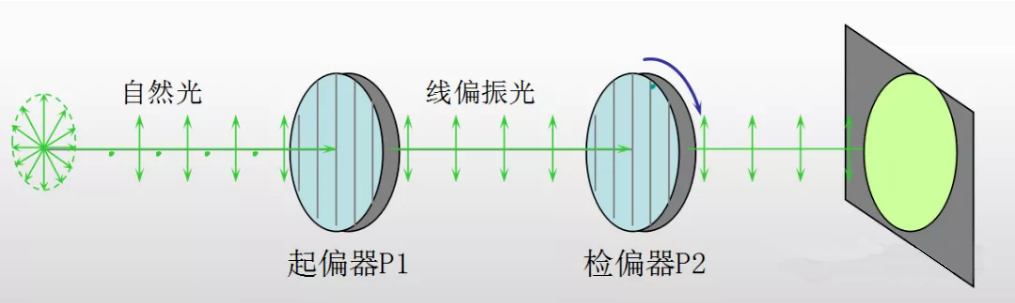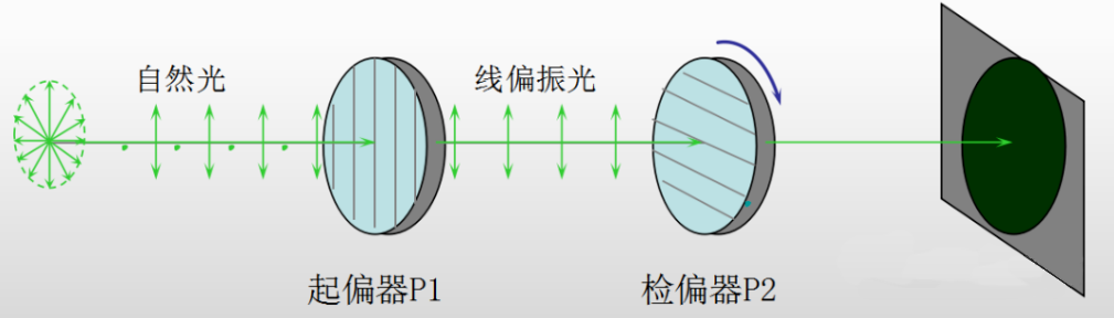 为了更好地理解光的偏振现象,我们可以借助实验装置进行生动地阐述。在图3、图4中,P1(起偏器)、P2(检偏器)是两块同样的偏振片。在图3中,自然光(如灯光或阳光)通过偏振片P1后,形成了偏振光。但由于人的眼睛没有辨别偏振光的能力,故无法察觉。