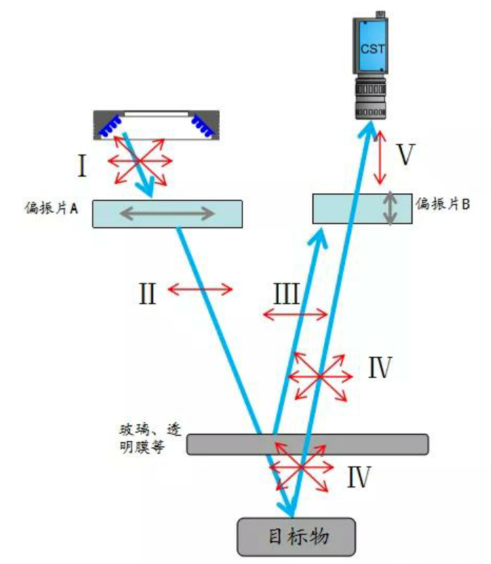 这里以透明包装膜内的工件检测为例,阐述一下偏光光源的光路原理。如图7所示,由光源发出的光Ⅰ经过偏光片A得到如光Ⅱ的线偏振光。光Ⅱ遇到包装膜时部分会发生镜面反射,即产生光Ⅲ,同时部分会透射至目标物表面并形成漫反射光Ⅳ。此时光Ⅳ经过目标物的反射,振动方向发生变化,再透过玻璃面时偏光状态仍然混乱,变成非偏振光。 在光Ⅲ和光Ⅳ中,光Ⅳ可透过偏光片B,变为光Ⅴ(偏振光)并到达相机的CCD,但只含单方向偏光成分的光Ⅲ会被偏光镜B挡住而不通过,因此可去除玻璃或者透明膜上的镜面反光,轻松提取目标物上的特征信息。