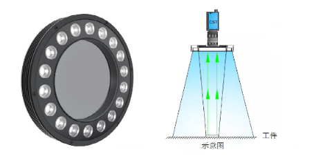 下图展示了偏振光源的典型系统组成,主要应用部件为常规光源、起偏器和检偏器。起偏器集成在光源前部,使得自然光转换为线偏振光,经镜面反射后透过镜头前的检偏器,保证二者正交角度即可阻挡简单的镜面反光,有效去除(抑制)眩光发生。