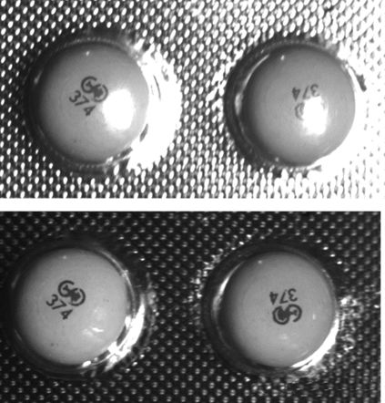 针对医疗行业中常见的药片漏装、缺陷检测,常常由于表面气罩包的存在导致成像存在眩光(局部过曝),难以清晰地观测内部药片情况。此时可以通过偏振光源实现表面清晰成像,去除气罩包镜面反射导致的眩光等现象。