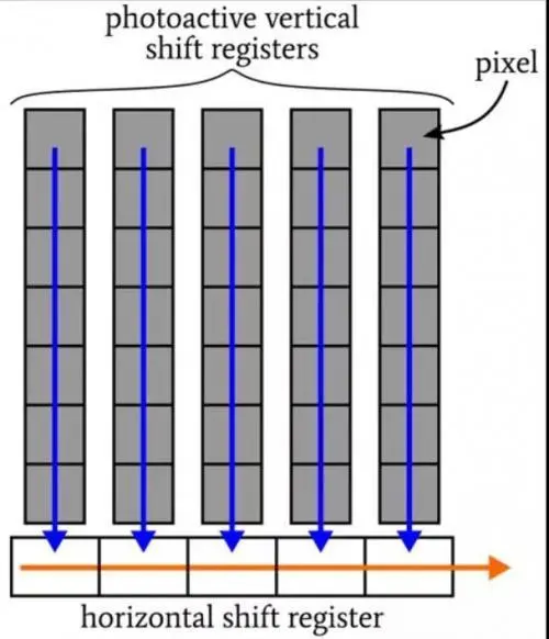 半导体区域既可以作为光电元件,也可以作为电荷转移器件,这有点违反直觉,但这正是 FF CCD 中发生的事情。在集成过程中,像素位置响应入射光子积累电荷,在集成之后,电荷包垂直地通过像素位置向水平移位寄存器移动。