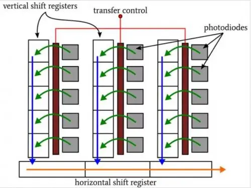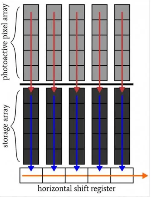 在集成之后,用于所有像素的电荷包被快速地传输到存储阵列,然后在存储阵列中发生读出。当读取存储位置时,活动像素可以为下一图像累积电荷,这使得帧传输 CCD 能够获得比全帧 CCD 更高的帧速率。