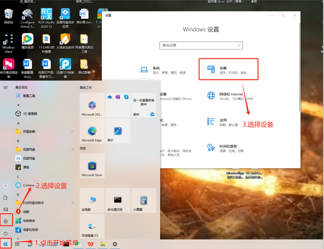 1、点击“开始”菜单----->点击“设置”----->点击“设备”