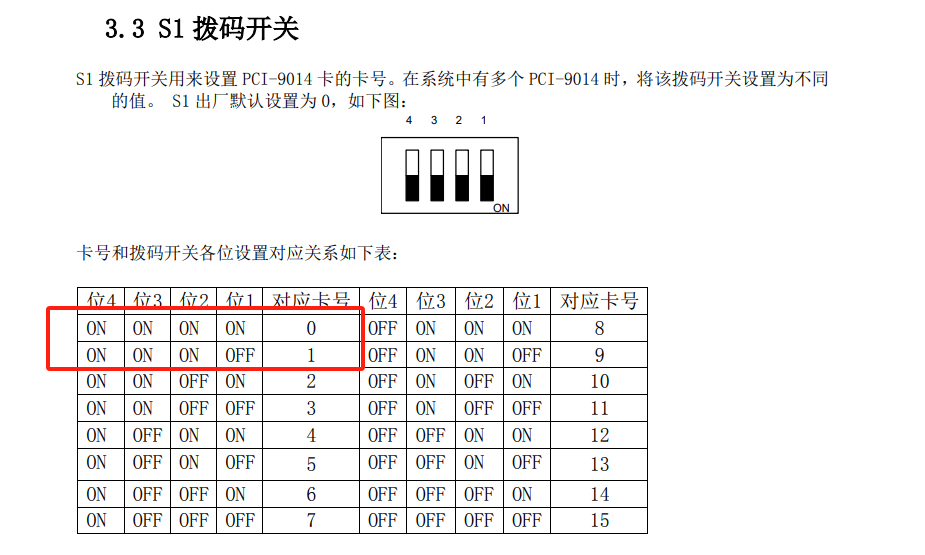8、如果安装多张9014板卡的时候要设置拨码,按照顺序拨卡号如0、1、2这样
