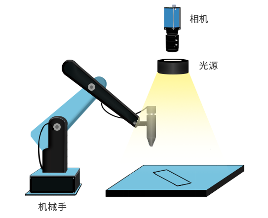 视觉定位系统采用打正向光方式,光源在机械手上方,CCD从上往下拍摄,进行图像分析定位。相机将计算出的像素坐标转换为点胶执行机构的物理坐标,视觉软件与机械手进行网口通讯,将视野内物料的物理坐标发送给点胶执行机构,点胶执行机构将胶体准确的点到产品上。