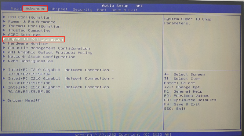 a.进入BIOS选择“Advanced”页面中,选择“Super IO Configuration”