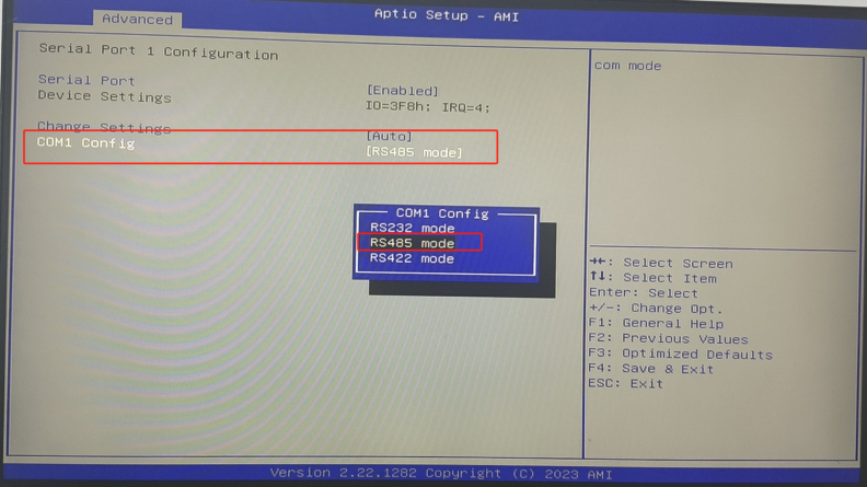 b.选择“com1”所在的选项,回车,选择“RS485 mode”模式,回车,按“F4”保存退出