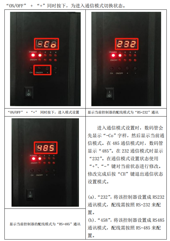 2、将SY-DL4CH-CV-24-C-GL光源控制器通讯模式设置成 485 模式,设置方法如下: