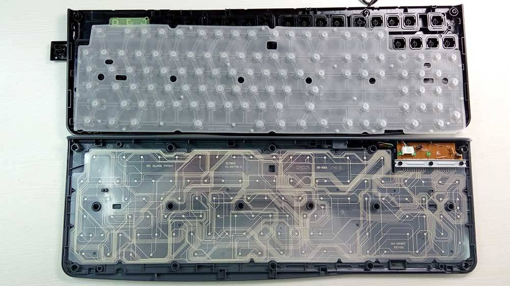 由于聚酯薄膜所具有性质的影响,使得该薄膜键盘具有良好的绝缘性、耐热性、抗折性和较高的回弹性。开关电路的图形,包括开关的联机及其引出线均采用低电阻,低温条件下固化的导电性涂料印刷而成。因此,整个薄膜键盘的组成,具有一定的柔软性,不仅适合于平面体上使用,还能与曲面体配合。柔性薄膜键盘引出线与开关体的本身是一体的,在制作群体开关的联机时,将其汇集于薄膜的某一处,并按设计指定的位置和标准的线距向外延伸,作为柔软的、可任意弯曲的、密封的引出导线与整机的后置电路相连。