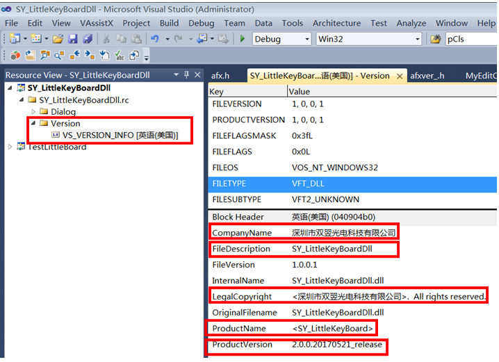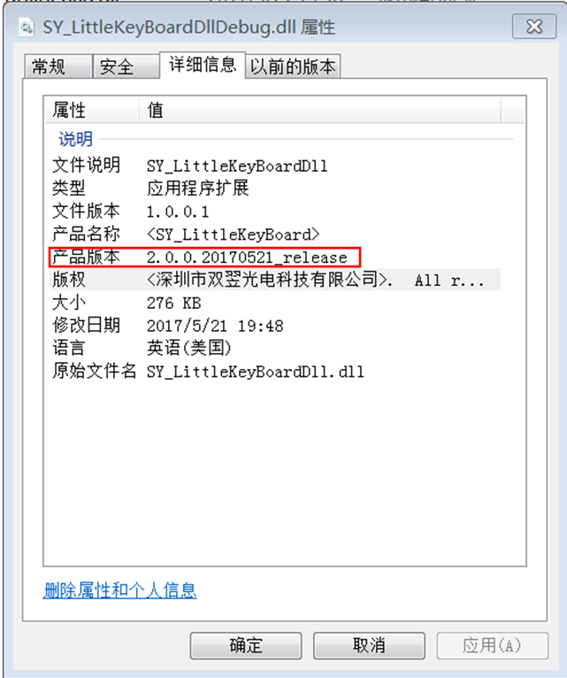 如:SY_LittleKeyBoardDll.dll该软件的版本号为:2.0.0.20170521_release,表明该软件为20170521编译,软件为最终正式版本。