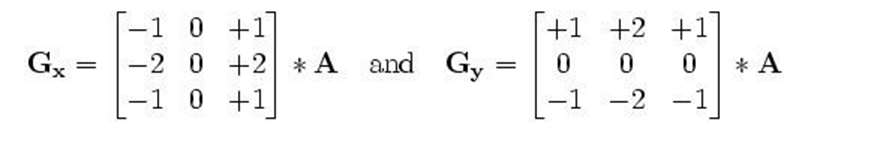 该算子包含两组3x3的矩阵,分别为横向及纵向,将之与图像作平面卷积,即可分别得出横向及纵向的亮度差分近似值。如果以A代表原始图像,Gx及Gy分别代表经横向及纵向边缘检测的图像灰度值,其公式如下:
