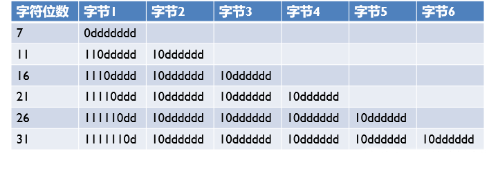 如图所示,我们可以看到字节1中前面的数字本标识字符的位数,当为0时表示7位,当110时表示11位,然后字节1之后的所有字节均通过10开头,这就是它的格式。