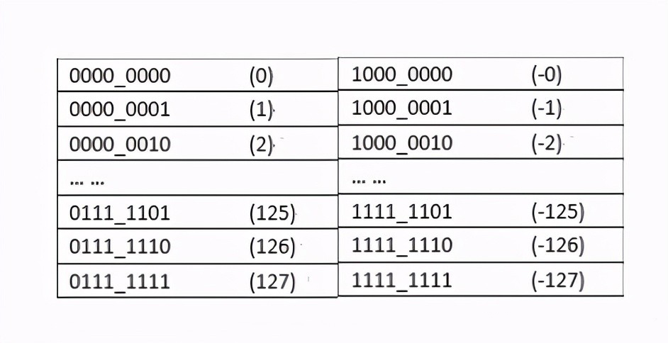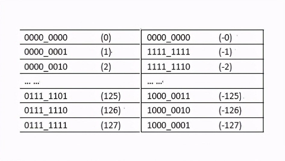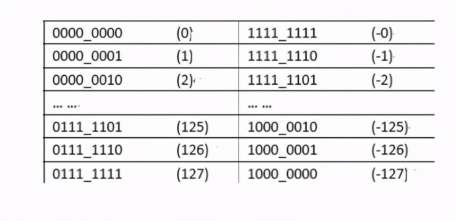 我们可以发现反码满足了负原码中每增加一个二进制单位对应的是递增的(1111_1110和1111_1111相比,1111_1111比1111_11110大),解决第一个问题之后,还有第二个问题,这个问题就是0的问题,因为没有正0和负零的说法,但是上面确有正零和负零区别,这就导致了重复的问题,这个时候我们发现当给负原码加1,那么0就统一了,如下所示: