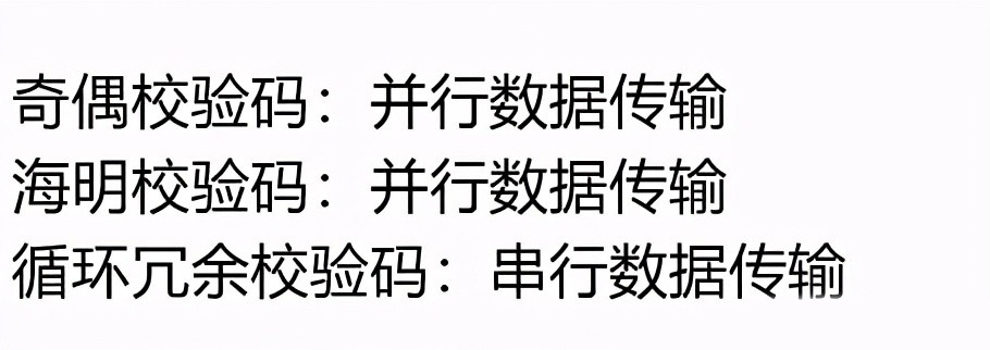 对待传输数据10110110约定采用其校验时,发送方所需要发送的校验码为010110110,对于接收方来说,如果接收到的数据中’1’的个数不为奇数时,就会认为数据出错。但是它并不知道哪里出错了,也就是它没有纠错的能力。