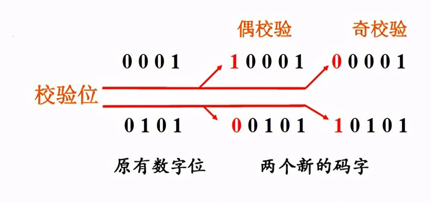 原理是在k位数据码之外增加1位校验位,使得K+1位码字中取值1的位数总保持为偶数(偶效验)或奇数(寄校验),举一个例子: