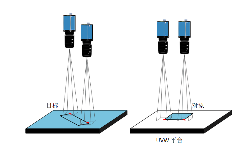 单目双Mark映射:目标端与对象端各设一个相机,通过Mark点角度差计算偏移,精度±0.05mm,适用于FPC与钢片贴合。
