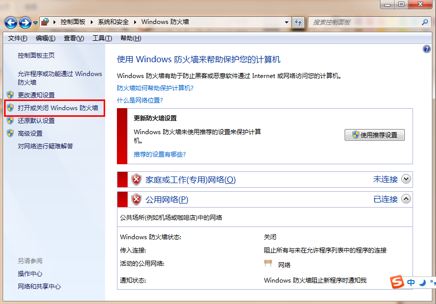 2、在“控制面板”-》“系统安全”-》“Windows防火墙”点击“打开或关闭Windows防火墙”;