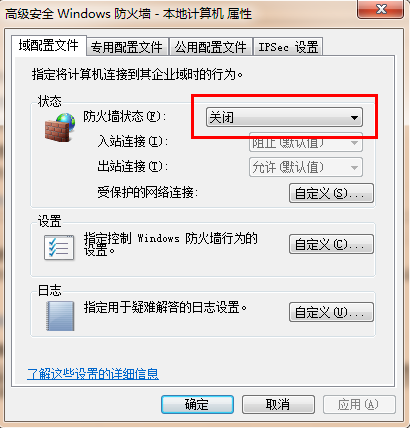 6、在“防火墙状态”的下拉列表中选择“关闭”;