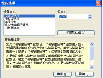 4、在“性能选项”页面,点击“传输描述符”,将值设置为最大2048;