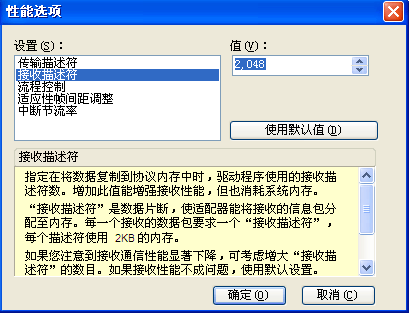 5、在“性能选项”页面,点击“接受描述符”,将值设置为最大2048;