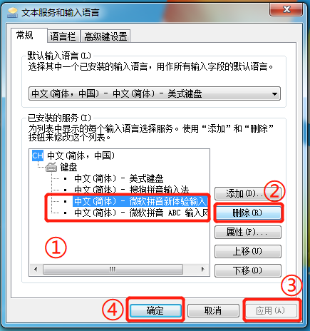 选中不需要的输入法,点击“删除”→“应用”→“确定”
